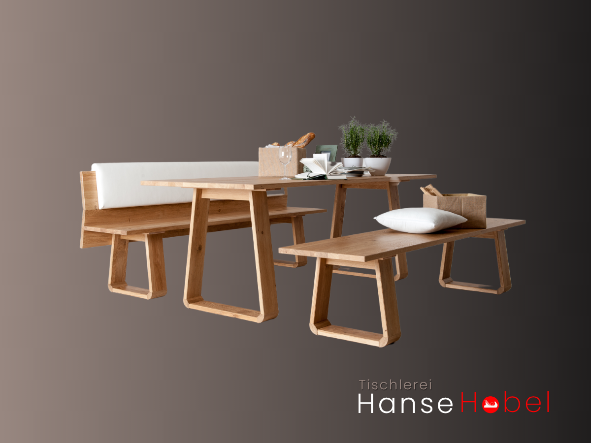 Massivholztisch mit abgeschrägter Kante & kraftvollem Untergestell. Dieser moderne Holztisch bringt Leichtigkeit mit robuster Bauweise in Einklang. Die Tischplatte hat eine elegante, abgeschrägte Kante und ruht auf massiven Beinen – ideal für Familien oder repräsentative Räume.